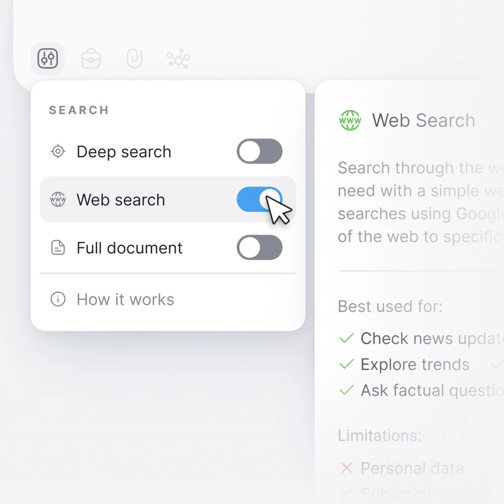 Switch between Efficient Search for fast answers, Deep Search to leverage tags and relationships, Web Search for up-to-date external trends or Full Document Search for comprehensive file analysis.