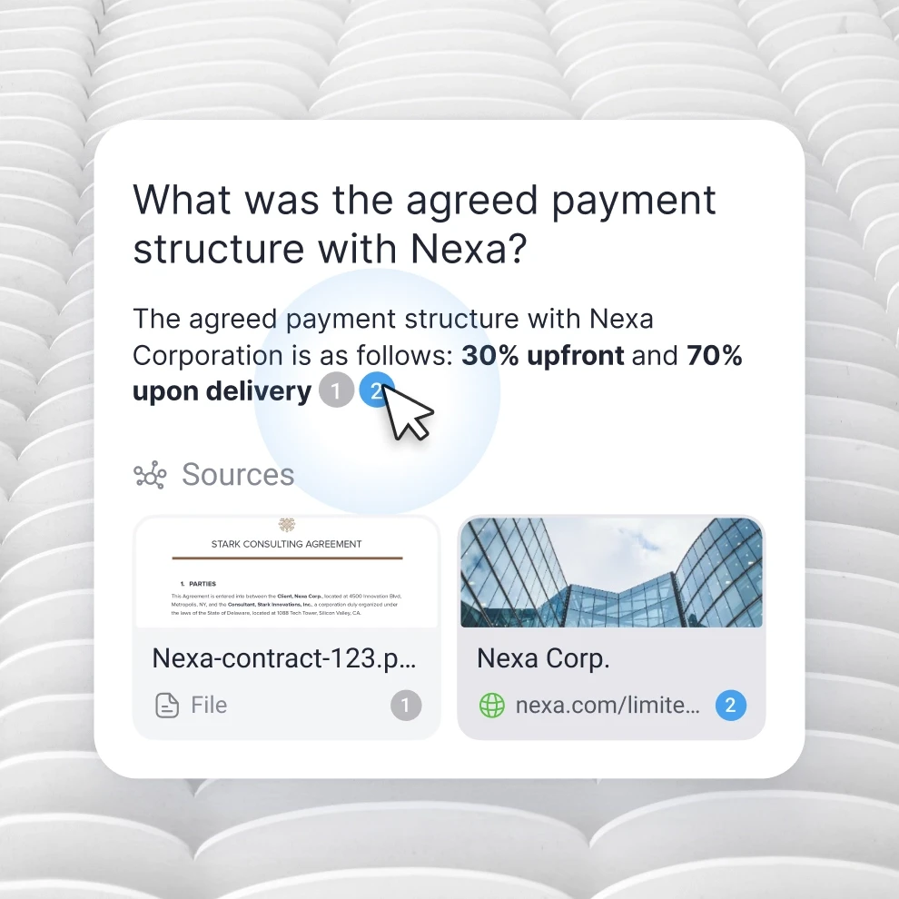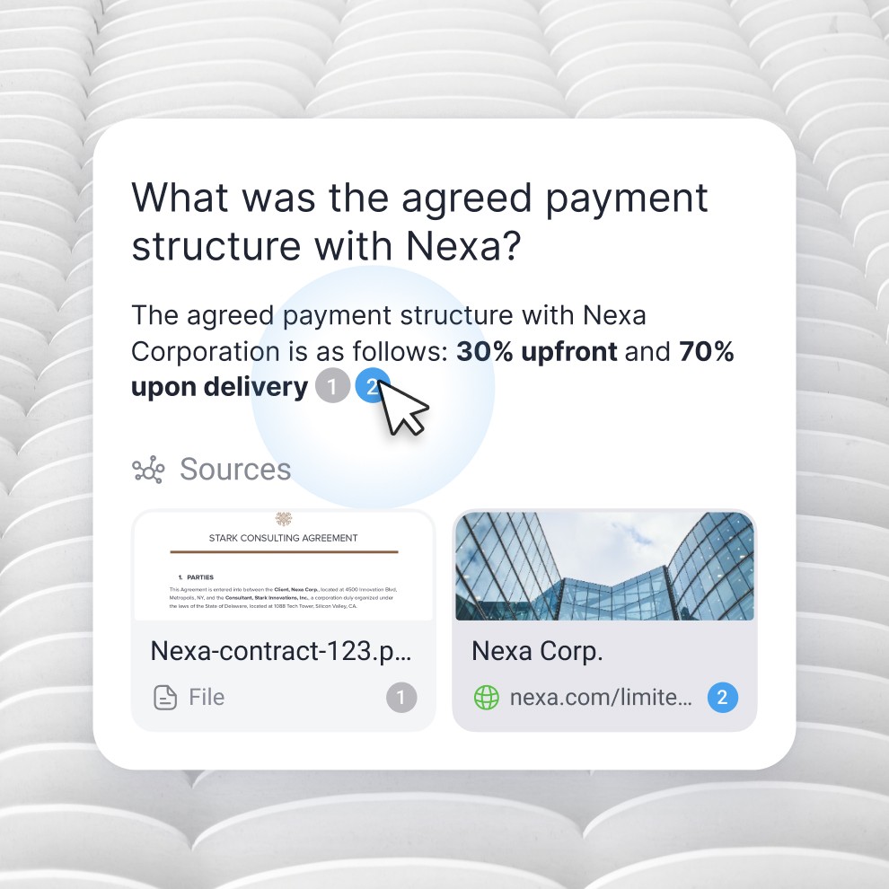 Every answer is grounded in your knowledge base, providing immediate, click-to-verify references and highlighting the exact source paragraph. You can also use powerful filters to refine results.