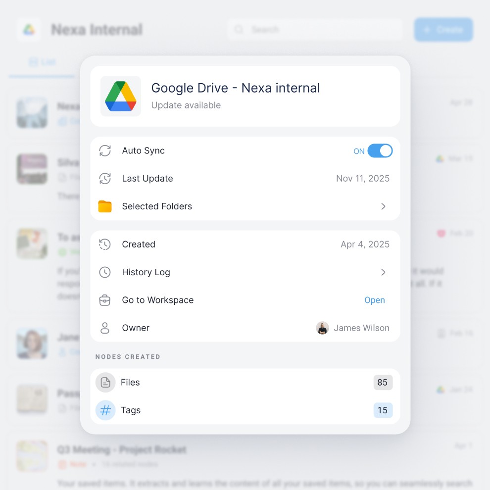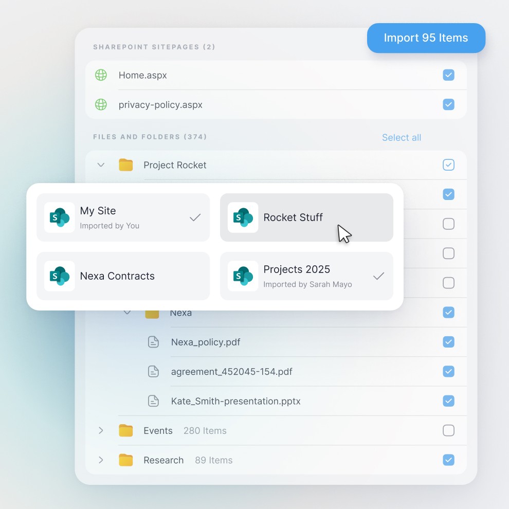 Connect to your SharePoint sites and documents. Use AI to ask questions about your projects and activate sync to keep it updated.